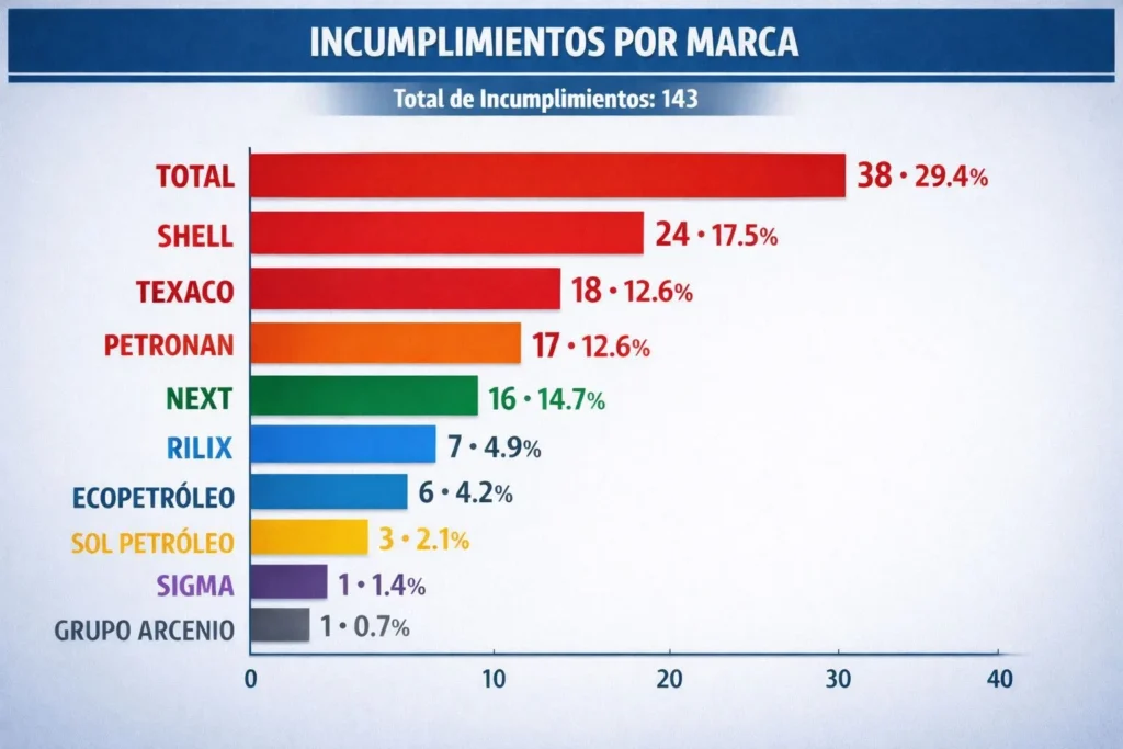 El análisis, realizado tras la inspección de 1,033 estaciones a nivel nacional, establece que las irregularidades se concentran principalmente en estaciones de Total, con 38 casos (29.4%), seguida de Shell con 24 (17.5%), Texaco con 18 (12.6%) y Petronan con 17 (12.6%). También figuran Next con 16 casos (14.7%), Rilix con 7 (4.9%), Ecopetróleo con 6 (4.2%), Sol Petróleo con 3 (2.1%), Sigma con 1 (1.4%) y Grupo Arcenio con 1 (0.7%).